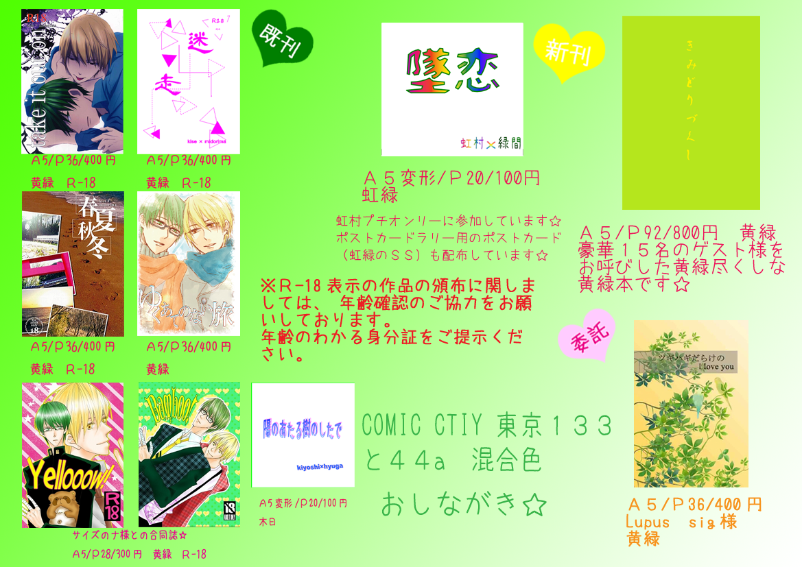 何度も繰り返すようですが、イベントに参加して、新刊や既刊を手に取っていただくたびに、黄緑好きな方がいらっしゃるうううう*:.。・*:.。*と、もろ手を挙げて喜んでいます。
