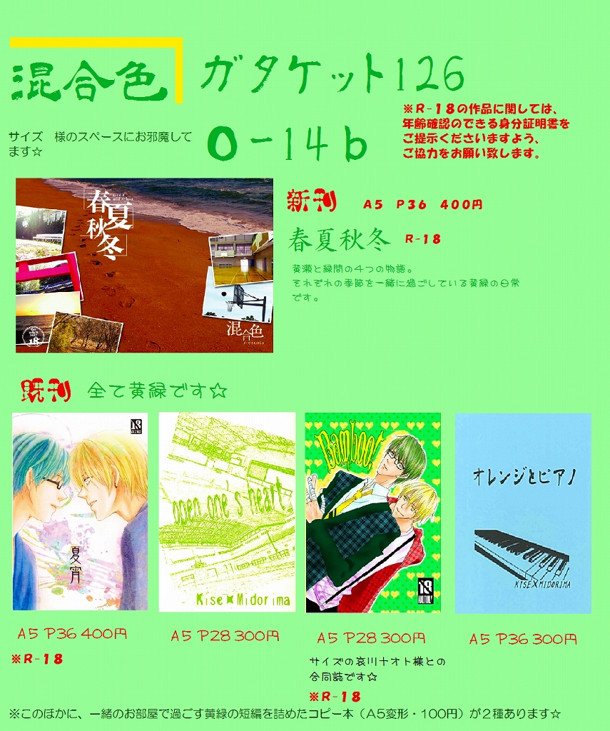 それで、3/17のHARUコミにて発行予定だった黄緑の個人誌とナさんとの合同誌は、3/24のガタケット126にて発行する予定です。