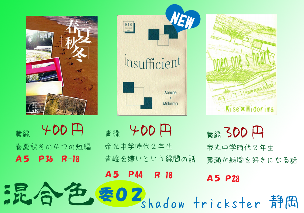 残念なことに3/17のHARUコミックシティ18での黒バス作品の頒布中止にともない、混合色のHARUコミックシティ18へは不参加となりました。゚(゚⊃◇⊂゚)゚。