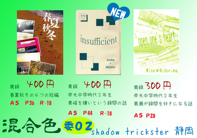 ST静岡、ST神戸にて先行頒布する予定だった青緑本『insufficient』は、一日だけ代替開催のST豊橋で頒布しようと思っております。